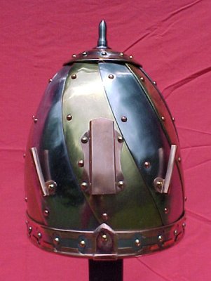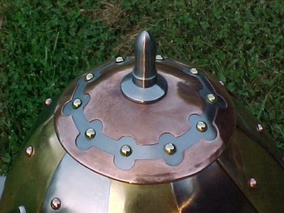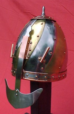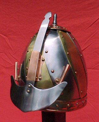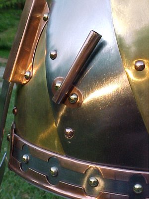 ensemble. The helmet is made from steel and brass with copper accents. It features a