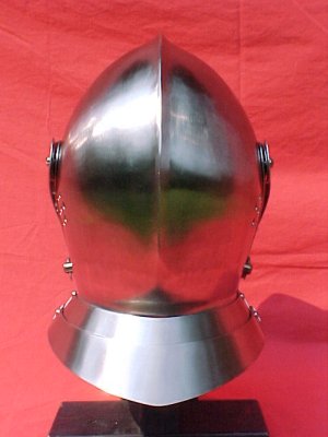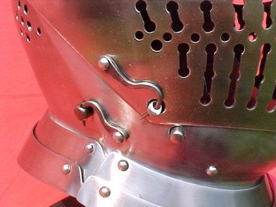 be made. The bevor is locked with a sneck hook on either side for safety, and